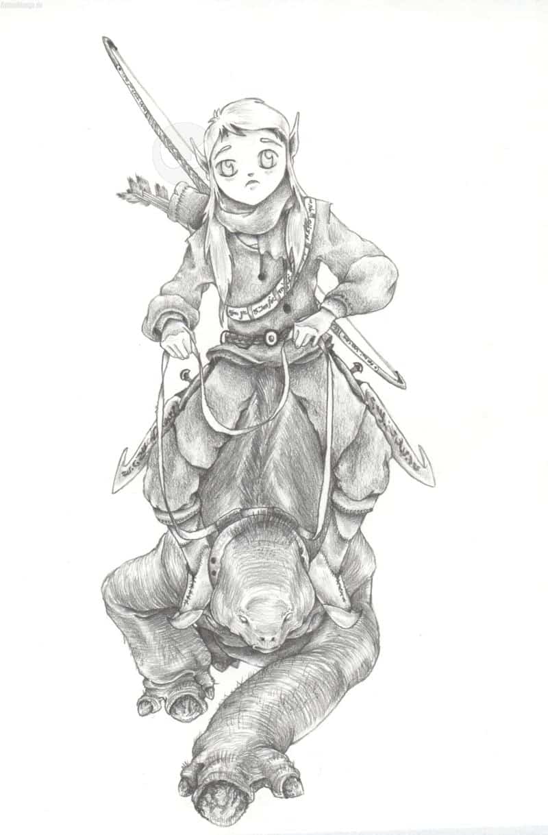 Ist entstanden nach dem ich den 1. Film sah. Würde sagen es ist ein Elbenjunge (mit viel zu grossen Ohren, ich weiss ~_~), der auf einem Steppentroll durch eine tiefe Schlucht reitet.
