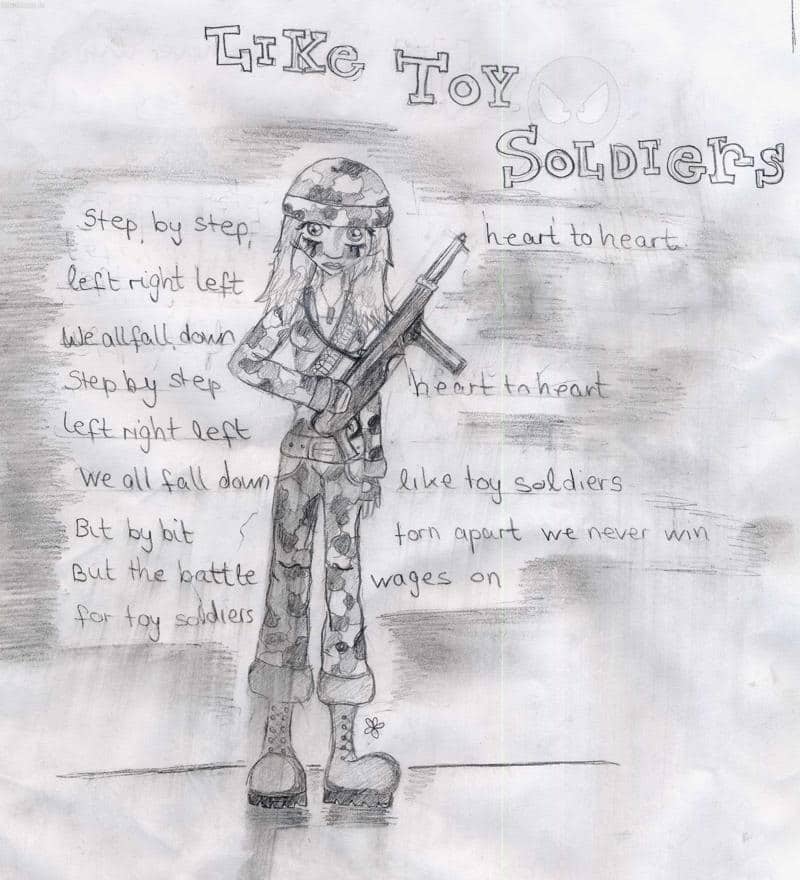 Leider war ich so dumm und hab mir nicht die ganzen Lyriks rausgeholt -.- Denn das Lied handelt ja eigentlich gar nicht über richtigen Krieg, so wie ich das gezeichnet hab >.< *chrm* Naja nächstes Mal muss ich wohl besser aufpassen wenn ich was zu nem Lied mache.