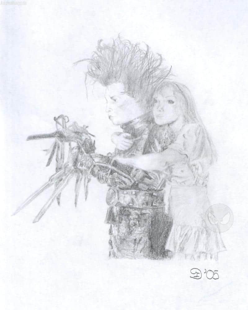 Das ist eine Szene aus dem mega geilen Film "Edward Scissorhands" :) Sie will, dass er sie umarmt und sagt "hold me" und er dann "I can't" woraufhin sie ihn dann umarmt *gg* Ich liebe diese Szene einfach und hab sie deswegen gemalt