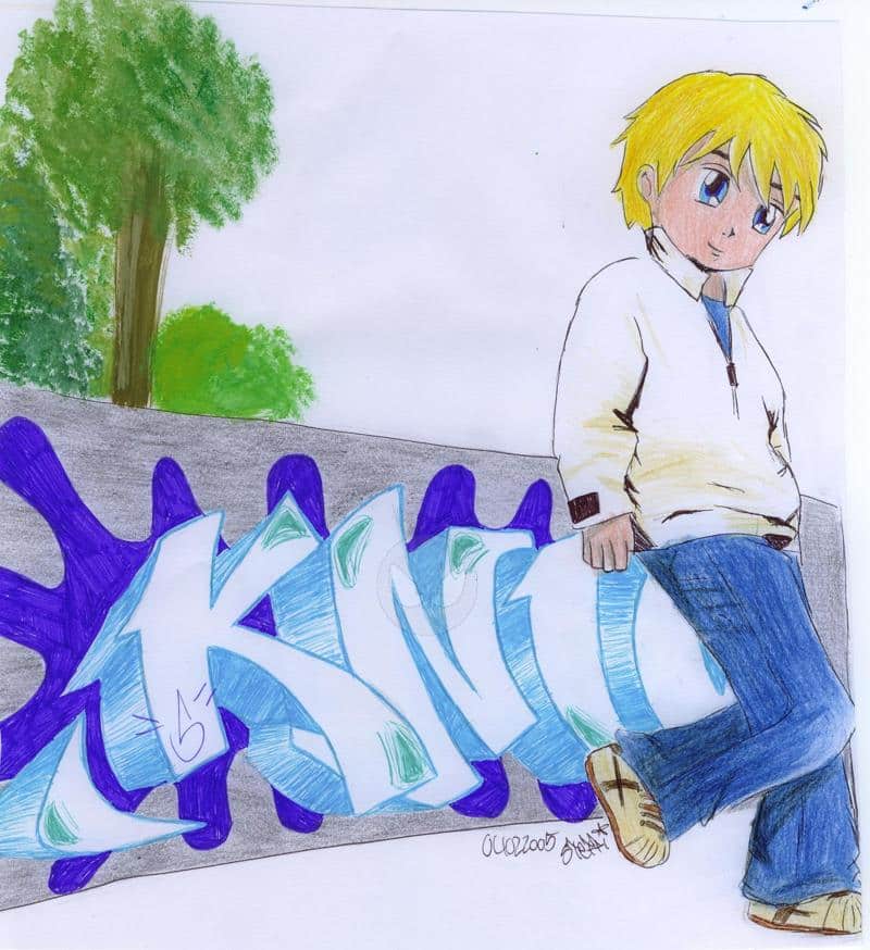 ja....ich find das bild schön...komisch, dass ich ein kerl mit blonden haaren gemalt hab...das verwundert mich jetzt immer noch...ich find seinen blich voll beruhigend....hmpf...die füße sind zu klein geworden, und die hose sieht komisch aus, aber sonst find ichs cool...^^ und ich mag das graffity...bloß das wort ist nicht so toll....aber ich wollt ein k malen...-.- zum hg: ich hatte keine deckweiß mehr..also konnte ich keinen schönen blauen himmel malen...und nur bäume wollt ich nicht, also hab ichs gelassen...