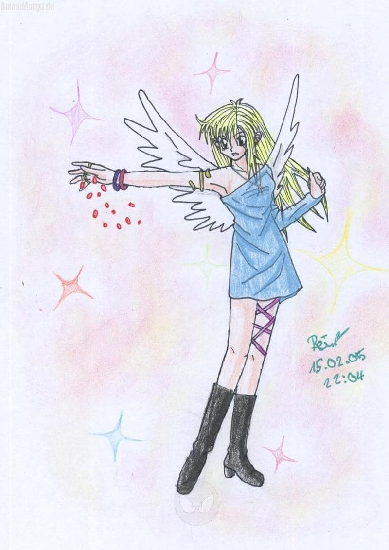 Ich finde es ganz ok, auch wenn die Pose bloß abgezeichnet ist … T-T So, wie ich auf diesen Pic die Schwingen gezeichnet habe, will ich sie immer zeichnen … Gefällt mir viel besser. Tjaja, und das Rei Flügel hat, hat ja immer noch was mit meinem und Tonys RPG zu tun … ^^“ Zum HG sage ich mal nichts und zu dem Rest der Color erst recht net …