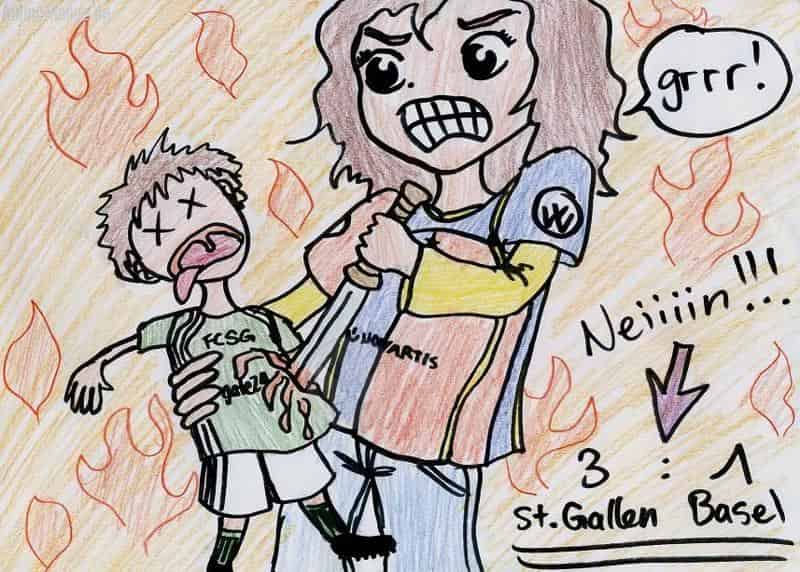 wie man sieht, ist das ganze bild durch reine wut entstanden (nachher gings mir schon viel besser) und wieso? also: mein lieblingsverein, der fc basel hat heute nachmittag auswärts gegen den fc st. gallen gespielt und sie haben 3:1 verloren!!!!!!!!!!!!!!!!!!!!!!! grrrrr!!!! weil erstens das terrain schlecht war (ein gemisch aus schnee und schlamm) und sie zweitens nicht in bestform waren. auf dem bild erstech ich gerade eine st. galler voodoo (ist das richtig geschrieben?) -puppe und ich selber trag natürlich ein fc basel t-shirt... tja ich denk zwar nicht, das ich kommies krieg, aber ich würd mich trotzdem freuen...
