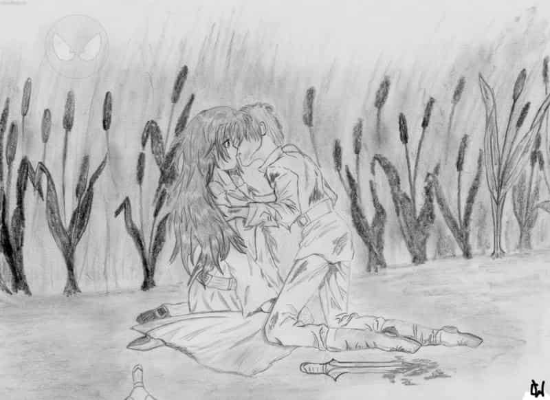 der junge heißt lumiere. er ist ein grabräuber und ist einer von satos männern. das mädchen ist noreia (kennt ihr ja schon). die szene beschreibt, wie lumiere im kampf fällt. noreia, so lieb wie sie is, versucht ihm noch zu helfen. doch für lumiere gibt es keine hilfe mehr. das letzte was dieser tut, ist noreia zu küssen. diese is natürlich total perplex, da lumiere immer so getan hat, als würde er sie nicht mögen...etwas kompliziert das ganze...^^'