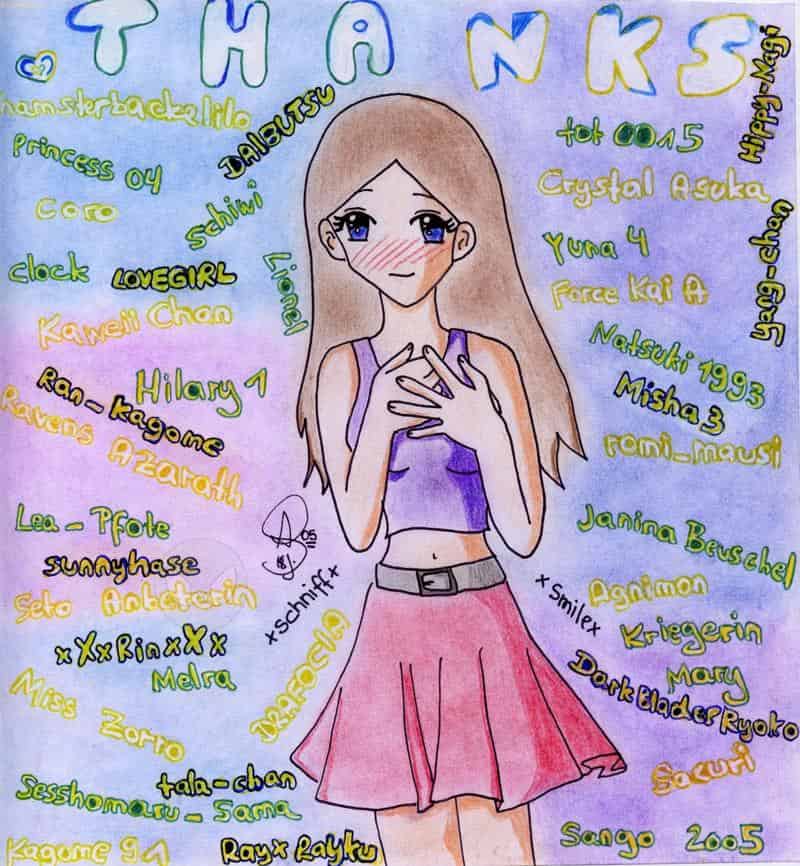 Wie ein paar schon gemerkt haben: Ich habe mittlerweile mein 100stes-Pic-hochgeladen!!! *smile* Und das ist Anlass genug, mich mal richtig bei allen zu bedanken!!!! Also: Ich danke euch für eure lieben Kommis zu meinen Pics und meinen FF`s, für eure GB`s, PN`s, für die vielen supermegagenialen Pics die mir gewidmet wurden, manchen auch für ihre Brieffreundschaft, und auch dafür, dass es euch gibt!!! *smile* Ohne euch wäre animemanga.de nicht dasselbe!!! Durch euch wird diese Seite hier etwas ganz besonderes!!! Ich hoffe, ihr könnt alle Namen lesen… und ich hoffe auch, dass ich keinen vergessen hab… wenn doch, dann tut es mir unendlich leid!!!! Das war dann bestimmt keine Absicht!!!! Und auch, wenn ich aus versehen nen Usernamen falsch geschrieben hab!!! *verlegen smile* Ich habe mir Mühe gegeben, möglichst alle, denen ich zu Dank verpflichtet bin, aufzuschreiben. Ach ja… noch was zum Pic… Das Girl bin ich… ich hab versucht, ein bisschen im Chibi Style zu zeichnen… na ja… ist nicht so mein Ding, diese Chibis… aber egal!!! Mir gefällt es trotzdem!!! Und so wie ForceKaiA letztens so schön geschrieben hat: „Fehler machen ein Pic erst zu etwas besonderem“. Ein besonderes Pic für ganz besondere Menschen!!! *smile*