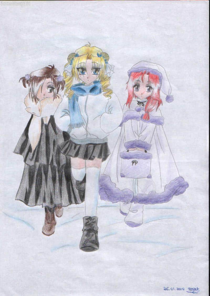 drei psychos im schnee; von rechts nach link: das Große, Bastet(ich) udn die Melfkuh