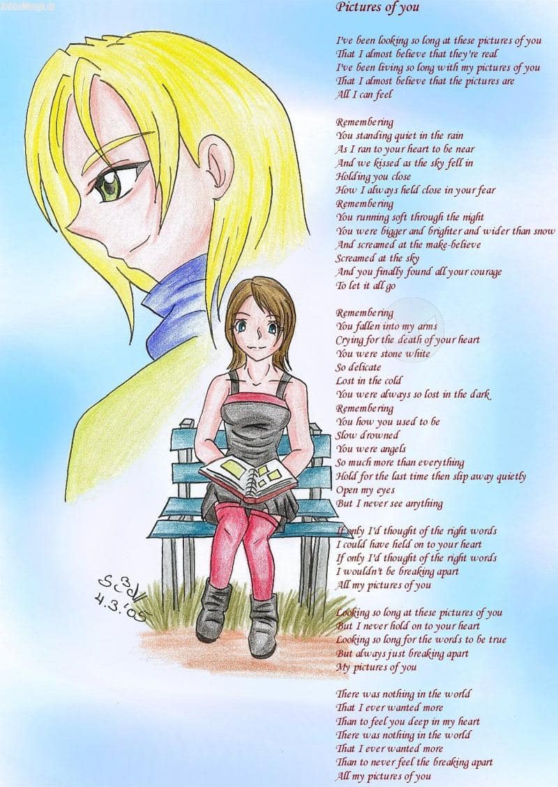 So fertig^^ ich hab mal wieder ein kreative ader *lach* in plannung sin noch drei andere bild. Das is zu einem song von "The Cure" und zwar "Pictures of you" einer meiner lieblings songs von den. Eure Sid//