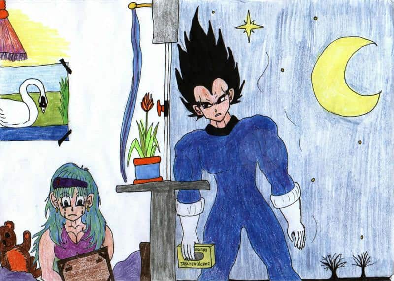 Bulma ist tränenüberströmt...und vor ihrem Fenster lauscht Vegeta..und fragt sich ob er Schwäche zeigen würde, wenn er sie tröstet.........auf den Hintergrund des Bildes welches sie in den Händen hält, wollte ich erst noch "..zur Erinnerung, Yamchu ..." draufschreiben...das sah allerdings verkehrt aus...ich weiß...die Hände sind verkehrt...