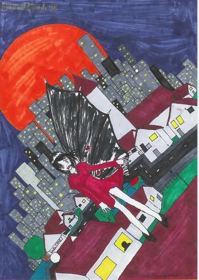 Für alle, die das Bild nicht verstehen... das ist ein Halbvampir(deswegen auch nur ein Flügel). Ja, die Farben... teilweise vom Scanner verhaut, teilweise konnte ich mit den Copics nicht umgehen... *muahaha* und nochmal: ERBARMEN! BITTE!