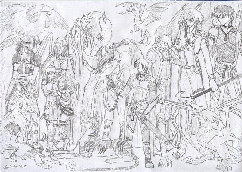 ich hab zum ersten mal geschaft alle charaktere meiner geschichte auf ein blatt zu zwängen.dummerweise steht die eigentliche hauptfigur nicht in der mitte sondern weiter links (das mädchen das so ängstlich guckt).der typ in der mitte ist der einzige mensch in dieser gruppe, die anderen sind halbdrachen ( bis auf den kerl ganz links ,der seine freundin umarmt, der ist ein vampir).