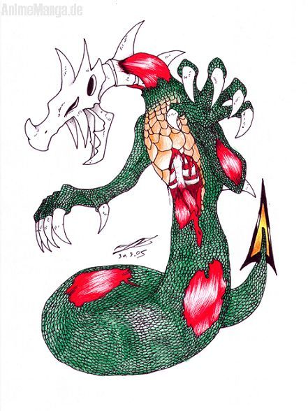 ich komm gleich mal zum bild; es stellt einen schlangendrachen dar, der kurz vor seiner völligen zerstörung steht. ich denk am kopf erkennt man bereits den anfang'. wie auch immer....das rote sollen irgendwelche muskeln sein, das innere ....naja ich geh mal nich näher drauf ein. (es gehört aber nich zum adult fanart, oder....')