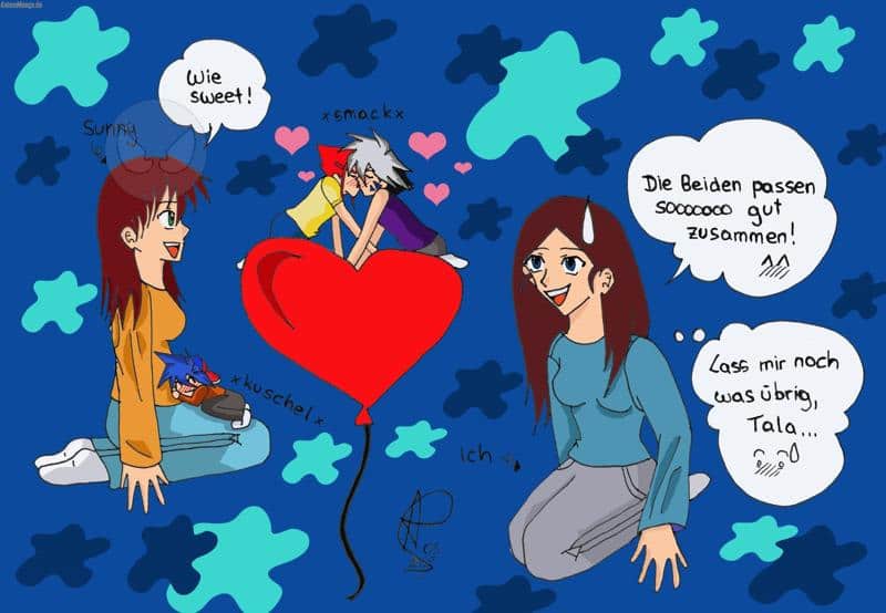 In dem Pic an mich hast du Tala auf nem Luftballon gezeichnet!! Das fand ich soooooo sweet!! Also ist dieses Pic entstanden!! Tala und Kai sehen so sweeeeet aus!!! *schwärm* Aber trotzdem sollte Tala lieber seine Zunge da lassen, wo sie hingehört *MEIN KAIIIII*… na ja… egal… Ich mag das Pic total gerne!!! Und der Takao, der auf deinem Schoß schläft, sieht auch total niedlich aus!!! So was von putzig!!! *gg* Der HG ist vielleicht ein klein wenig übertrieben… na ja.. egal… gefällt mir trotzdem… Ich hoffe, du magst das Pic… Ich lege dir nen Ausdruck im nächsten Brief bei… und die Outlines auch!!! *smile* lg Magic.