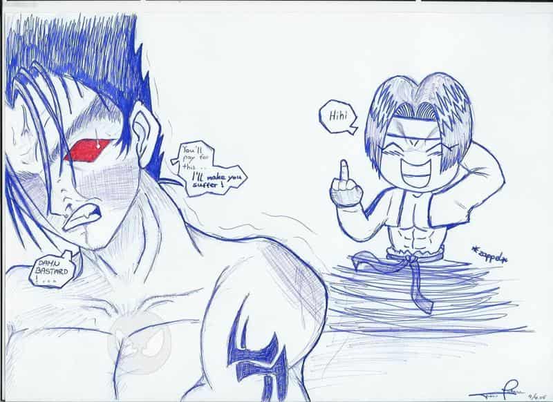 Ja ich weiß.. WIEDER TEKKEN und WIEDER KULI... aber hey... nach millionen von Kommis schreiben *selbertätschel:P* hatte ich endlich mal wieder Zeit und Lust ein weiteres Bild zu zeichnen... Gazu bin ich inspiriert worden von Naomichan ohne die ich dieses Bild nie gezeichnet hätte... weiter hin widme ich das Bild noch Pfauenauge (Maya die grad in Spanien ist...) , Romy und Anh (die meisten kennen sie unter Ever).. nochmals grüße an euch... Ferner hatte ich nicht so eine gute Laune... ich wollte das Bild eigentlich etwas brutaler machen aber da mein Bruder lange in meiner Nähe war konnte ich nicht ganz das zu Papier bringen was ich 'fühlte' dachte oder wie man das sonst noch nennen kann... Da ich meine Kommis an 2 Händen abzählen kann bitte ich um KOMMIS und ordentliche Benotung (Falls dein Name Kenshin333 ist kannst du gleich wieder leine ziehen...das sollte mal gesagt sein...)... falls ihr eine von den am Anfang aufgelistete Personen seit dann müsst ihr einen Kommi schreiben oder wenigstens ne Benotung hinterlassen da ich euch schon so gutmache *mitderfaustdroh*... NEIN natürlich braucht ihr keine Kommis schreiben o.ä aber es wäre schön....So nebenbei fällt mir auf das ich sehr viel schreibe.. nagut dann werd ich mal mit meinen Wallas chillen gehen und/oder chillen... Jeg skrider (dänisch für ,,ich verzieh mich'')