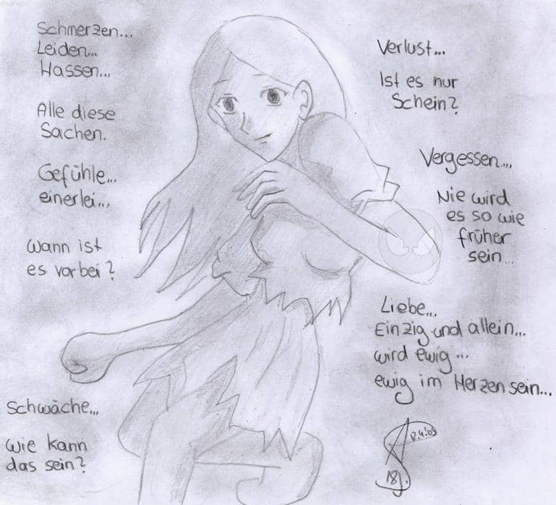 Für meine kleine, tapfere Schwester!!! Das Gedicht hab ich an dem Abend geschrieben, als ich auch das Pic mit dem lächeln gezeichnet hab... ich habs nur mit Bleistift coloriert... weil ich fand, es passt besser dazu... naja... egal... ich finds echt schön... obwohl ich nicht weiß, was die Pose soll... jedenfalls hofe ich, du verstehst, was ich dir mit dem Gedicht sagen will... ich will, dass du nicht aufgibst!! Denn auch wenn du verloren hast, was dir am liebsten auf der Welt war... die Liebe bleibt ewig... Oh mann... das ist schon wieder so ein Pic, wo ich nicht genau weiß, ob es dich traurig macht... ich hoffe nicht... das wäre echt das letzte, was ich will... naja... wie auch immer... ich hab dich lieb, kleine Schwester!!! lg Magic.