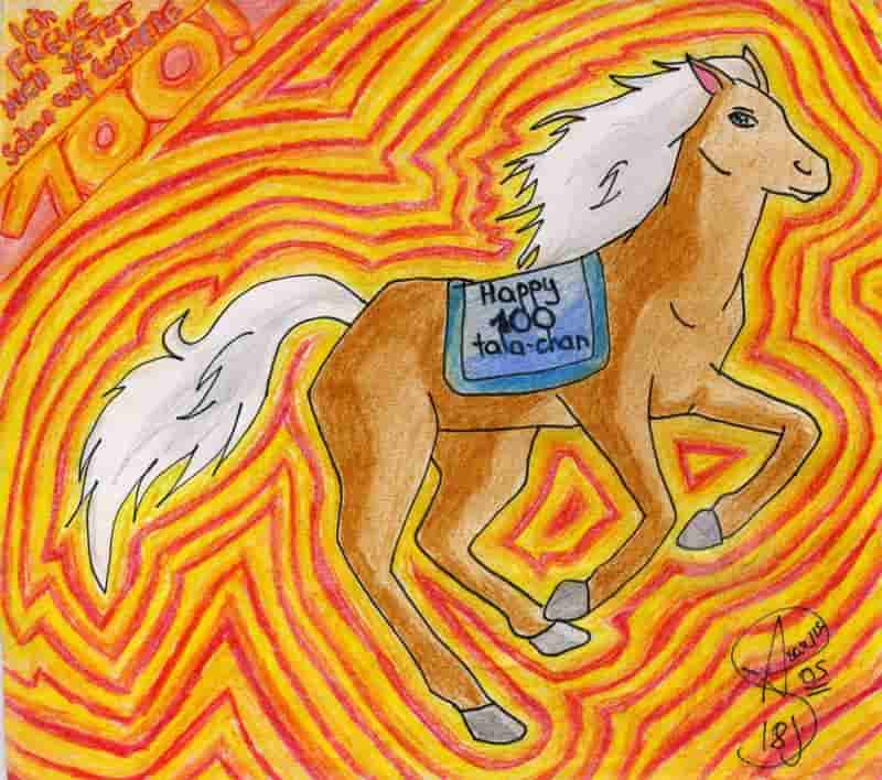 Happy 100 tala-chan!! *smile* Weil du in letzter Zeit so coole Pferde gezeichnet hast und die mir so gut gefallen haben, dachte ich, ich zeichne dir auch mal ein Pferd!! *smile* Leider kann ich es nicht so gut wie du... aber ich hab mir echt Mühe gegeben!! *gg* Bin extra auf den Dachboden gegangen und hab ein altes Barbie-Pferd rausgesucht, damit ich ne Vorlage zum abzeichnen hab!! *smile* Und für den HG hab ich echt ne halbe Ewigkeit gebraucht... *smile* Aber ich finde, es hat sich gelohnt!! Also nochmal alles Gute!! lg Magic.