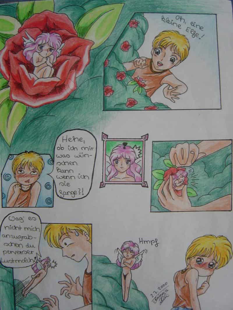 Heute habe ich mal bei mir im Zimmer ausgemistet und dabei diesen kleinen Comic entdeckt den ich 2000 gemalt habe. irgendwie fand ich ihn zu schade zum wegschmeissen, also habe ich ihn gecolort und nun ist er hier ^^ ich hoffe man kanns einigermaßen gut erkennen, ist doch recht klein geworden beim hochladen! Mit den Büschen hab ich mich beim colorn auch schwer getan, sie sind leider dunkler geworden als ich es eigentlich wollte. Ich hoffe es gefällt einigen ^^