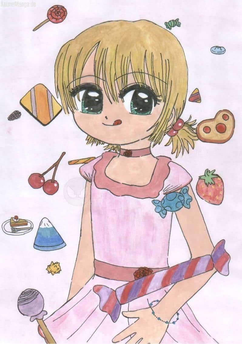 Ein Mädchen um sie herum Süßigkeiten.