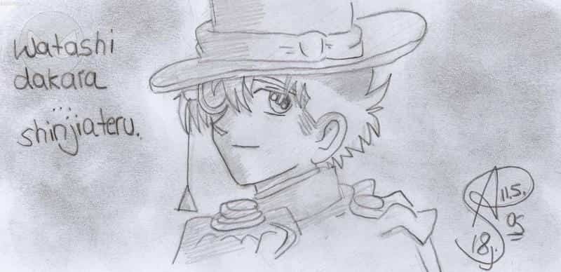 Das hab ich Mitte dieses Monats gezeichnet... und leider hab ich total vergessen, es hochzuladen... aber das hab ich ja jetzt nachgeholt!!! *smile* Ich mag den Blick von Kaito voll gerne!! *schwärm* Und das Watashi dakara shinjiateru bedeutet: Weil ich daran glaube. ICh hoffe, ich habs richtig geschrieben. Ich kenns von Sora`s FF, den sie mir gewidmet hat. Da fand ich es so schön, dass ich es hier ins Pic eingebaut hab... ach ja... und sorry, dass die Bleistift Colo nicht so gut ist... na dann... wie auch immer... lg Magic.