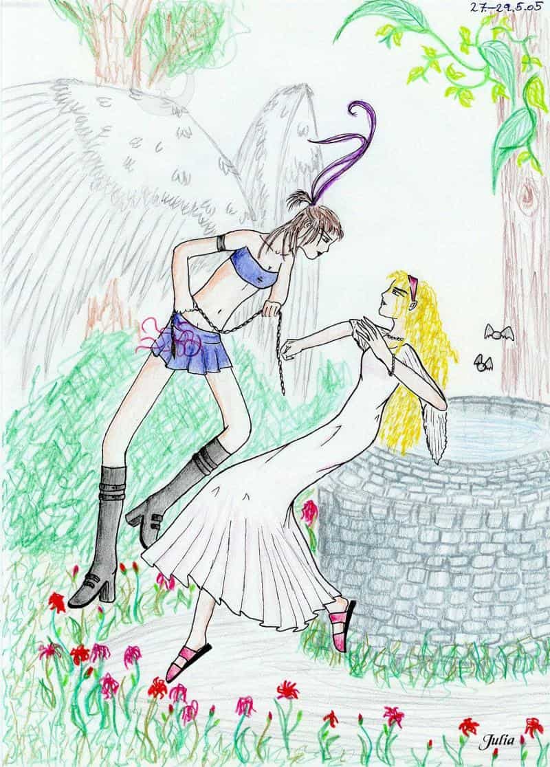 Ach, was soll ich sagen. . . Ich hab mir als Hintergrund halt gedacht, dass manche Menschen immer in Wohlstand leben während irgendwo andere verrecken, dass sie sagen, den Engel würden sie das verdanken, aber. . . was tun Engel dann für scheiße Sachen, wenn sie die Reichen reicher machen? Sie können doch gar nichts dafür, dass sie diesen Ruf haben und trotzdem mag ich die Bezeichnung "Engel" nicht, weil es keine Wesen ohne "Sünden" gibt!