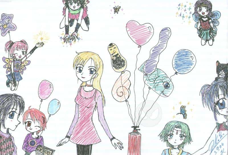 Hier ist ein bunter Mischmasch aus verschiedenen Mädchen. Einpaar Elfen, ne Katze, Schmetterlinge und Luftbaloons. Wollte einfach neue Stifte ausprobieren, die sind zwar nicht zum malen gadacht aber... hat Spaß gemacht. XD