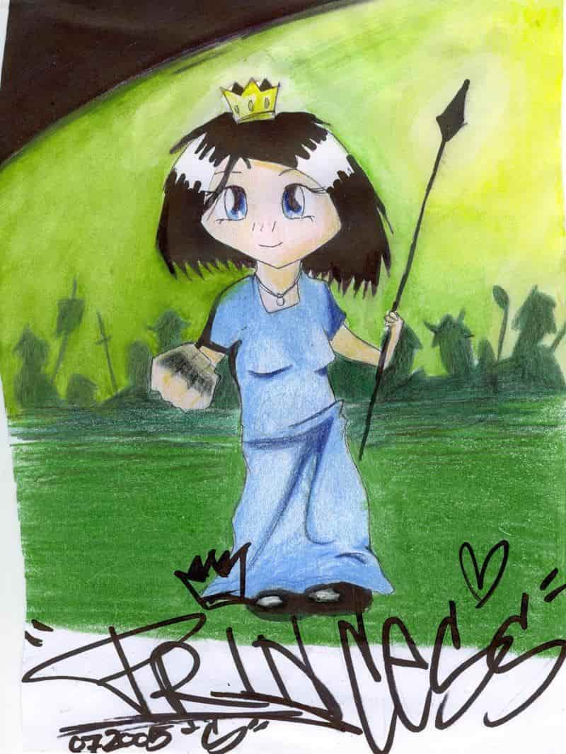 hm...kein plan was ich zu diesem bild sagen soll....habs eben grad gemalt...hat vielleicht 15 minuten gedauert. und ich hab zum ersten mal aquarellfarben benutzt....aber nur im himmel....ich glaub, des ist mir nicht so gelungen...aber ich mag die farbwahl. aber ich mag ja eh alles, was grün ist. jedenfalls ist das a kleines prinzesschen mit nem speer in der hand. die verteidigt mit dem volk dahinten ihr land oder so...kp...ich bin ziemlich verwirrt grad, also...kp -.- viele grüße an shadow und fischi...ich zähl auf eure kommis ^^