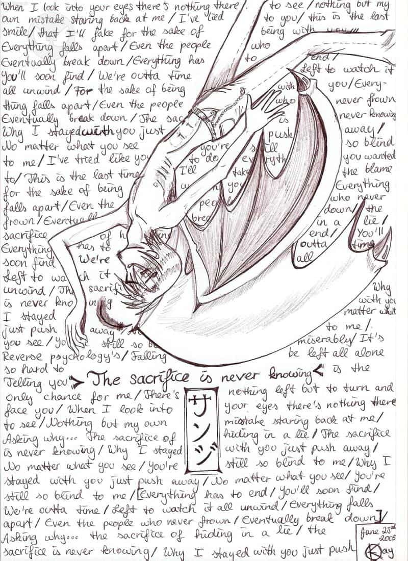 Mein Scanner ist endlich wieder daa.. ~///~ Deswegen hab ich da eben mal was mit dem Kugelschreiber hingelatzt.. Ist eigentlich ganz okay, nur am Oberkörper gefällt mir irgendwas nicht o.ô den Fehler muss ich wohl noch finden >_>' *Sektglas erheb* Auf mein Scanner~kun (JA, es ist ein er |D)! Auf viele neue jahre voller Arbeit.. *mit Knöcheln knacks* Wehe, du spinnst noch einmal = =.. Das Lied ist von Linkin Park - P5shing Me Aw*y ^~^b ich liebe es... /// Achja, ich geb es zu, ich hätte es deutlicher machen können.. Aber: Seine Flügel sind gleichgroß u.û wenn man genau hinsieht. Es sieht nur so aus, weil der linke Flügel weiter unten ist und man das Ende nur an einer Ecke erkennen kann.. Er fliegt ja schließlich auch nicht (Was mit der Position der Flügel sowieso problematisch wäre o.O), sondern lässt sich fallen XD