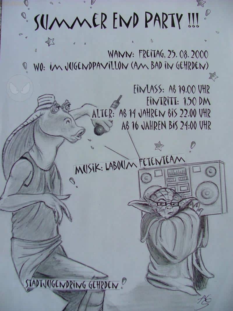 Hihi^^... Das ist aus dem Jahr 2000, wie man unschwer erkennen dürfte. Ich wurde hier gebeten ein Plakat für eine Party zu entwerfen, die zu der Zeit hier in der Stadt für die Jugendlichen steigen sollte. Eine "Summer End Party" zum Ende der Ferien eben. Ich hab mir gedacht, es wär doch lustig, dies mit bekannten Charakteren aus Film und Fernsehen darzustellen - und da war dann diese Idee mit dem Yoda, der den Ghetto-Blaster trägt, und dem "Raggea-JarJar" (<- wird das so geschrieben??? *am kopf kratz*). Hab aber sowas ähnliches auch schonmal irgendwo anders gesehen und fand es sehr lustig. Und so entstand dann dieses Pic^^. Ich dachte, ich mach nichts verkehrt, wenn ichs euch mal zeig - in dieser "Kommieflaute" auch nicht so schlimm, denk ich. *smile* merle-chan^^