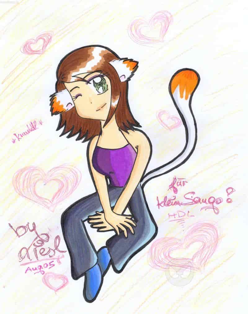 *ihr pic überreich* hoff du magst es n bissl.. ich weiß es hat viele fehler.. pose is net besonders [für meine verhältnisse zwar scho XDD] .. hoff ich hab deine kleine mira halbwegs hinbekomm!.. weiß auch net genau warum ich ihr so weiß-orange-katzen-öhrchen und -schwänzchen gegebebn hab[vl weils vorher einfach nur ne doofe skizze war.. und noch net Mira... und de teil hatte auch noch andere haare.. aba ich hab die pose und katzen-dingsis beibehalten] *drop* keksi hat den prototyp vo dem pic (in bleii-version) mal bekomm.. der is scho üba´n monat alt ^^
