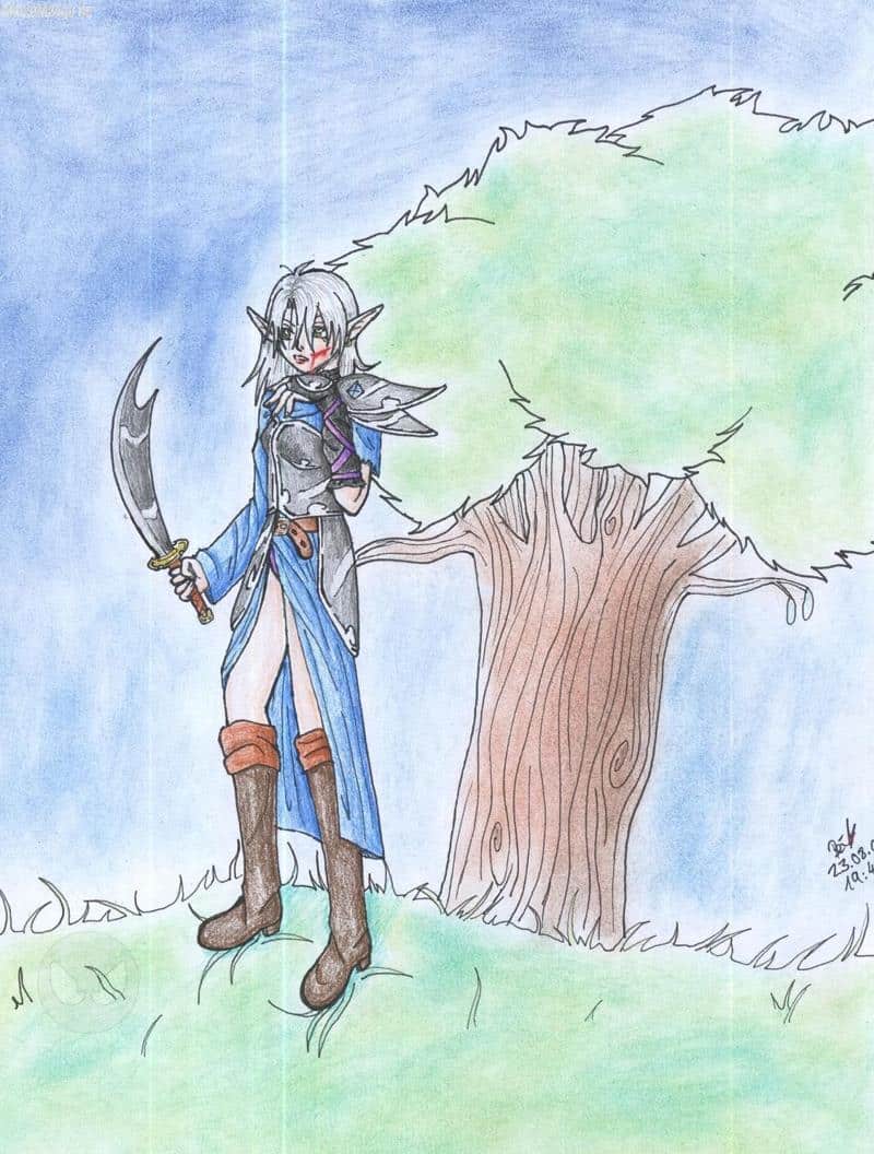 Nun wollte ich auch noch eine Waffe haben und da habe ich ihr so einen Krumsäbel/ein Krumschwert(???) in die freie Hand gezeichnet. ^^“ (Sieht übrigens schrecklich aus!)