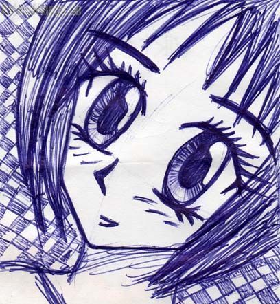 Sooo... nachdem ich jetzt wieder Zeit hab hab ich paar Bilderchen gescannt. Hier ist das zweite, das in der ersten Ferienwoche entstanden ist. genau wie das mit dem großen Auge auf sonen kleinen Notizblock mit Kugelschreiber. Ich finds ganz okay aber nicht überweltigend. Sie schaut bissl dumm aus XD... Also den kleinen Kindern am Tenniscamp, auf die ich aufgepasst hab haben es toll gefunden XD... Baba Wiggieh