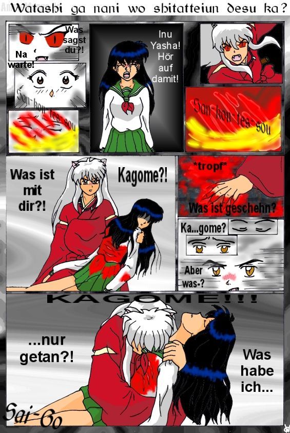 falls mans nich erkennt hier ne erklärung: inu yasha wurde zum dämon und hat gemordet. kagome hat ihn angefleht, dass er aufhören soll, doch inu lässt sich das nich gefallen und macht kurzen prozess mit ihr. und als er wieder normal ist sieht er was er getan hat. seine geliebte kagome ermordet. *snif*