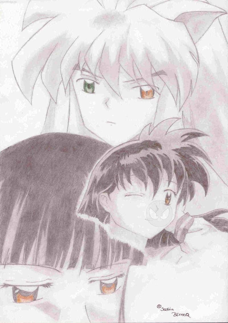 So nunja...dieses Bild ist für einen guten Freund von mir. Wir nennen uns gegenseitig immer Inuyasha und Kagome. Er wünschte sich die Augenfarbe von unserem kleinen Inu so. Also bitte nicht aufregen. Eigentlich wollte ich nur Inu und Kikyo zeichnen, aber dann hat Kikyo so nen Eierkopf bekommen, dass ich alles umändern musste T.T jetzt weiß ich auch warum ich Kikyo nicht leiden kann...Ich hoffe es gefällt euch trotzdem.