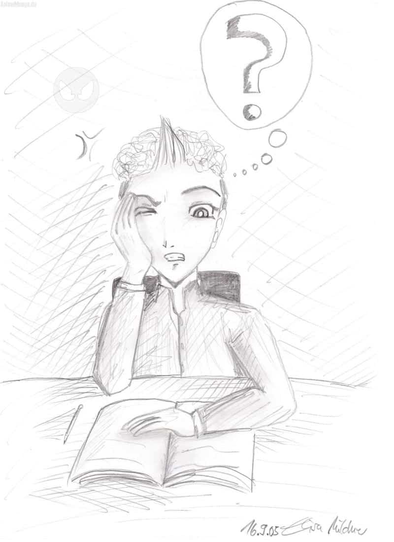 hier eine bleistift-skizze, auf der hiyoko, zu sehen mit einer arbeit oder so, zu sehen ist...