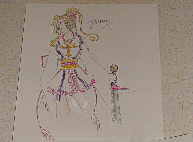 ich hatte neue glitzergelstifte gekauft und war eh widda jeanne-"Hippie". also ran an die stifte und losgemalt. da sind 3 jeanne(s) entstanden. diese sieht nich so prickelnd aus. aber naja, war ja auch nur zum Sifte probieren ^-^