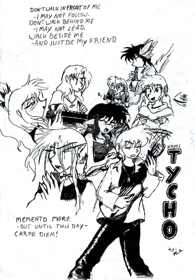 DAs entsnad auch in der Schule. Ich dachte, als Band würde meine Truppe ein ganz nettes Bild abgebn, leider fehlt Shinu, Gato ist eben die einzige, die sie beherrscht. Ich habe ewig gebraucht, um mir die Verteilung der Instrumente auszudenken, jetzt sieht das ganze etwa so aus: Torika und Basilek als Flöt-Dou (*fg*, ich musste die beiden sogar in diesem Moment ein wenig ärgern), Ukyo Faye (der rosahaarige Typ, der jetzt übrigens ein mann und Aiyoshas Lehrer ist) am Keyboard, Kimaru am Schlagzeug, Kaori macht ne kleine Tanzaufführung zu dem Zeug, Masamiko (Aiyoshas Lover) als BG-Sänger und Aiyosha als Sänger. Ruka-kun hat da eigentlich nix drauf zu suchen, aber er war die erste Person auf dem Blatt und der Restr hat sich erst nach und nach hochgezogen, also hab ich ihn dagelassen. Auch das Outfit ist vielleicht etwas ungewohnt, aber das von Ruka ist durchaus realistisch (Zur Zeit ist es für meine chinesischen Hemden zukalt, also lauf ich so rum)!... So, schon wieder nen Kilometer unnützen Text getippt....