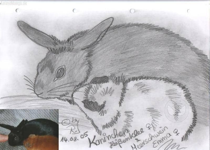 So die beiden waren mal meine Haustiere,ein Kaninchen Namens Heißenklee und Emma.Die beiden verstanden sich sehr gut,ich hatte zu diesen Zeitpunkt auch noch ein männliches Meerschwein das lebte mit dem Kaninchen zusamm und Emma wollte mit dem Männchen nichts zu tun haben!War schon ein lustiges Paar,ich lade das Bild gleich noch hoch!^^