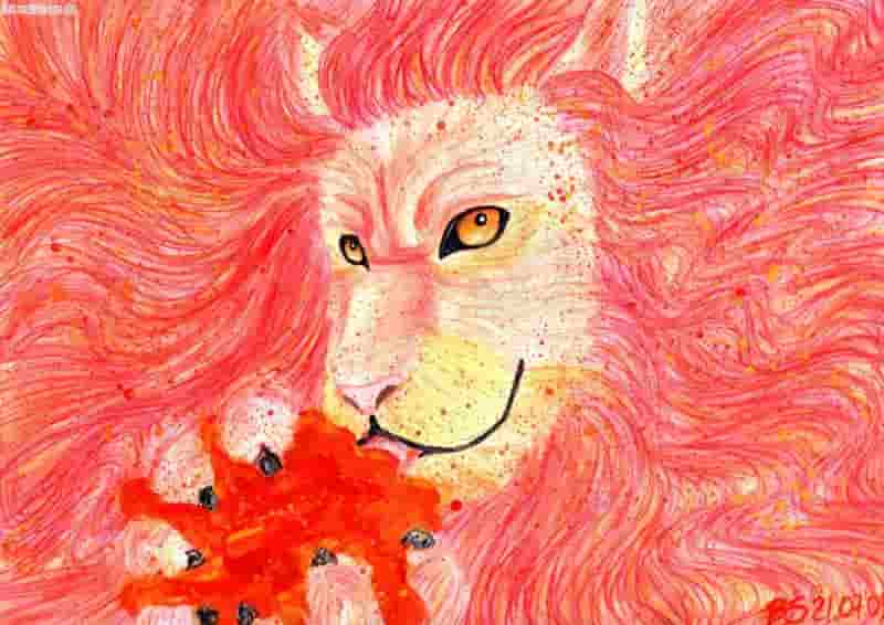 das sollte ich für eine... bekannte malen. sie wollte ihr stertnzeichen haben. einen löwen mit ner sonne (sonne0symbol des löwen) und da das element feuer ist, dachte ich, ich mal ihm ne brennende mähne. das ergebnis: *MÖP* sieht kacke aus!!! ich hatte die gloreiche idee, die mähne auch irgendwie als einzelne strähnchen darzustellen und hab mir meinen hintern aufgerissen und dann isses noch total blass geworden... am compi gehts noch, da hab ich dann die farben "satter" gemacht, aba trotzdem... *nicht zufrieden ist* bei der rechten seite der mähne hatte ich dann auch keinen bock. die linke seite ist so naja... und das schwarz war auch ne kack idee, ich habs in dem moment bereut, in dem ichs draufgemacht habe... viiiiiiiiiiiel zu dunkel! >x<;;; dafür gefällt mir aber das fell im gesicht und an den pfötchen. und ich finde es irgendwie "süß", dass er an dem bollen leckt... =_____=;;;