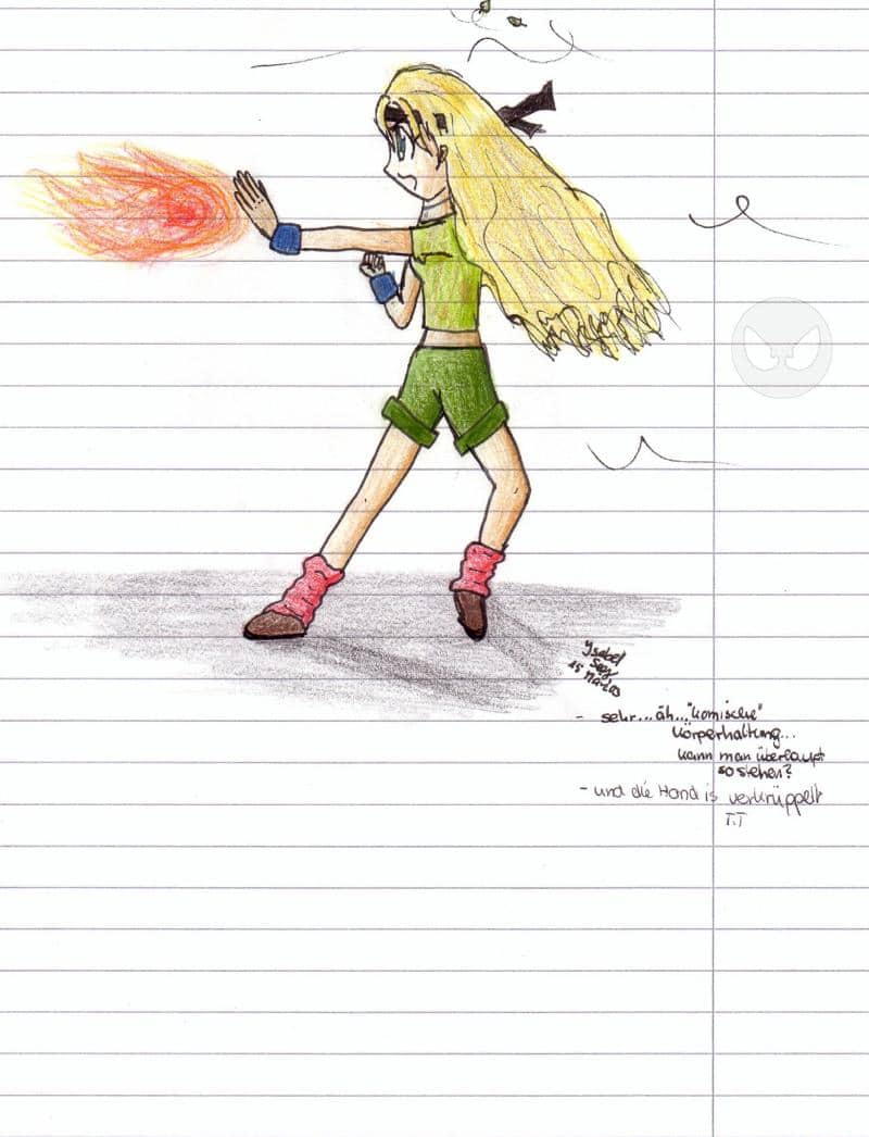 und: sie schießt des feuerdingens weg, sie hält es nicht ab. ^^