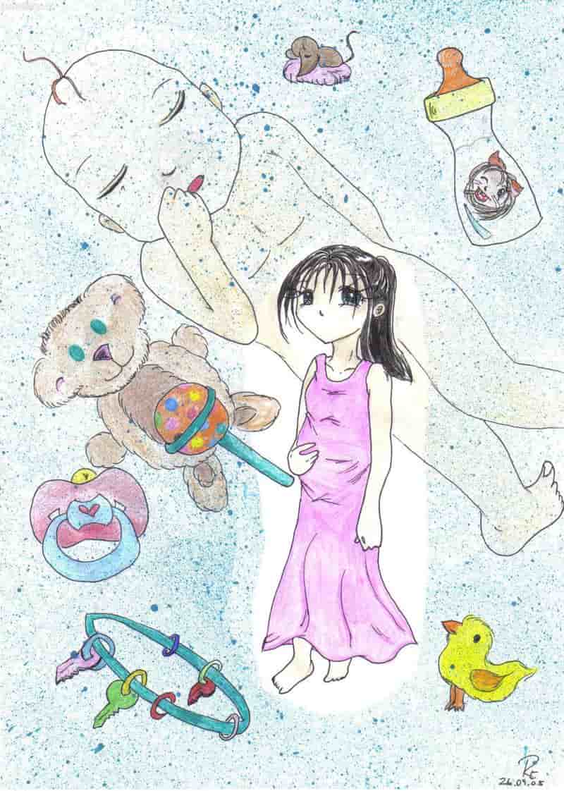 Ich weiß auch nicht, wie ich auf dieses Motiv gekommen bin. So wie meistens, wusste ich mal wieder nicht, was ich zeichnen sollte. Den Kopf von dem Mädel hatte ich schon gemalt und sollte beim Körper ankommen, als mir der Gedanke kam: „Hey, du machst aus ihr jetzt eine Schwangere!“. Und schwupp-di-wupp war sie schwanger!!! (so schnell kann das gehen