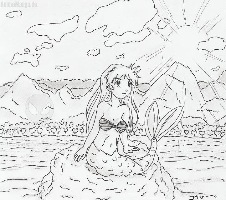 dass ist mein erstes bild mit hintergrund ich hoffe man kann erkennen das die meerjungfrau auf einem grossen stein sitzt und von wasser umgeben ist und dahinter sind ein paar bäume und Berge