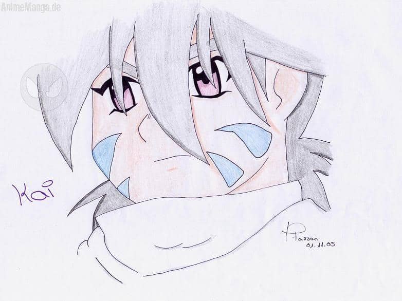 Und hier komme ich zu meiner letzten Staffel von Bildern: Beyblade! Das ist Kai, die Stränen sind ein bisschen dumm über die Augen gemalt, ich weiß! Eure Lady
