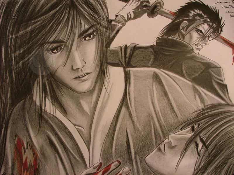 Und noch ein Bild – ein letztes Bild zu meiner Fanfic „Die Weiße Schlange“. Die Outlines hab ich schon geraume Zeit bei mir rumfliegen – aber jetzt dacht ich, ich machs mal fertig^^. Ist nicht das beste der Reihe zur FF, aber ich mag es trotzdem sehr, weil es eine meiner absoluten Lieblingsszenen in der FF wiedergibt – und wohl auch eine der emotionalsten. Zu sehen ist links natürlich Takeo-chan (NEINNNN, DAS IST KEIN MÄDCHEN! Ich glaube, das ist die größte Schwäche dieses Bildes... Man hält den guten Ta-chan fürn Mädchen... Und dann ist sein Gesicht auch noch reichlich schräg... *seufz* Aber versucht das mal! Ein Gesicht, das nach unten schaut ist proportional total schwierig zu zeichnen, find ich... *grummel*), dann sieht man unten Takeos sterbenden Bruder Mamoru und im Hintergrund meinen „Erzbösewicht“ Hajime Saito. Ich liebe diesen leicht melancholischen Ausdruck in Ta-chans Gesicht, der auf seine Hand und Mamorus Blut daran hinabstarrt – und zu begreifen versucht, dass sein Bruder stirbt.