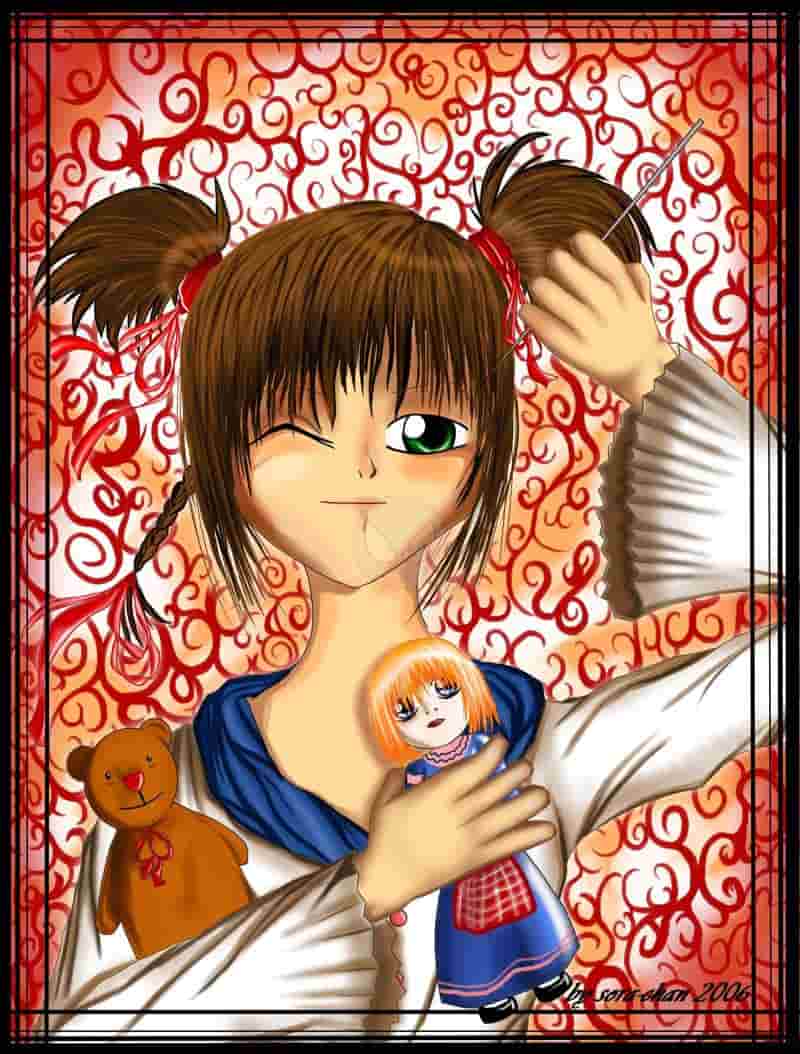 tja...mir war langweilig XD die nadel war nicht geplant....ich wollt den arm net so langweilig nach unten hängen lassen...zum Chara: also...ich spiel neuerdings theater...da bin ich irgendwie so reingerutscht...un das is püppiXD ...das ding, das ich spielen soll *hehe* ein kleines, mordlustiges mädchen, leibt vor allem kleine tiere wie meerschweinchen, käfer, spinnen usw. aba nur zum töten ////D die colo hat wie immer zu lang gedauert^^ ich bin fast verzweifelt mit der haut (ich kanns einfach net) der Hg hat allein scho ne stunde gedauert^^*knuff* s-chan