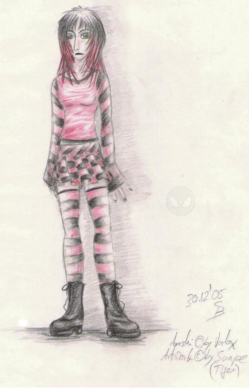 und wieder ein versuch mit buntstiften zu colorn. diesmal isses besser geworden, als bei nighty. ach ja, wer sich noch an meine ff eien wo erinnern kann (lang, langists her...), der erinnert sich vielleicht auch an arashi chan. ^^ ich hab sie in den klamoten gezeichnet, in denen ich sie mir im sienzehnten (?) kapilein vorgestellt habe. oder zumindest hab ich versucht, mir die klamotten ins gedächtnis zu rufen... sie hat sogar noch ihren arm, ich fands schade, ihn ihr nur wegen des bildes abzuhacken... im übrigen hab auch nicht wirklich ich sie erfunden, sondern mein papi, sprich vorlox.er hat arashi chan und auch hien chan erfunden und im original gezeichnet, ich hab sie nur in meine geschichte übernommen. die zeichnung oben hab ich nach einer originalskizze von meinem papi gemacht, wobei er mir mit ratschlägen was frisur etc angeht, tatkräftig zur seite stand. danke papi, auch wenn ich noch sauer bin, weil du unless gelesen hast und mir keinen gescheiten kommi geschrieben hast... -.-