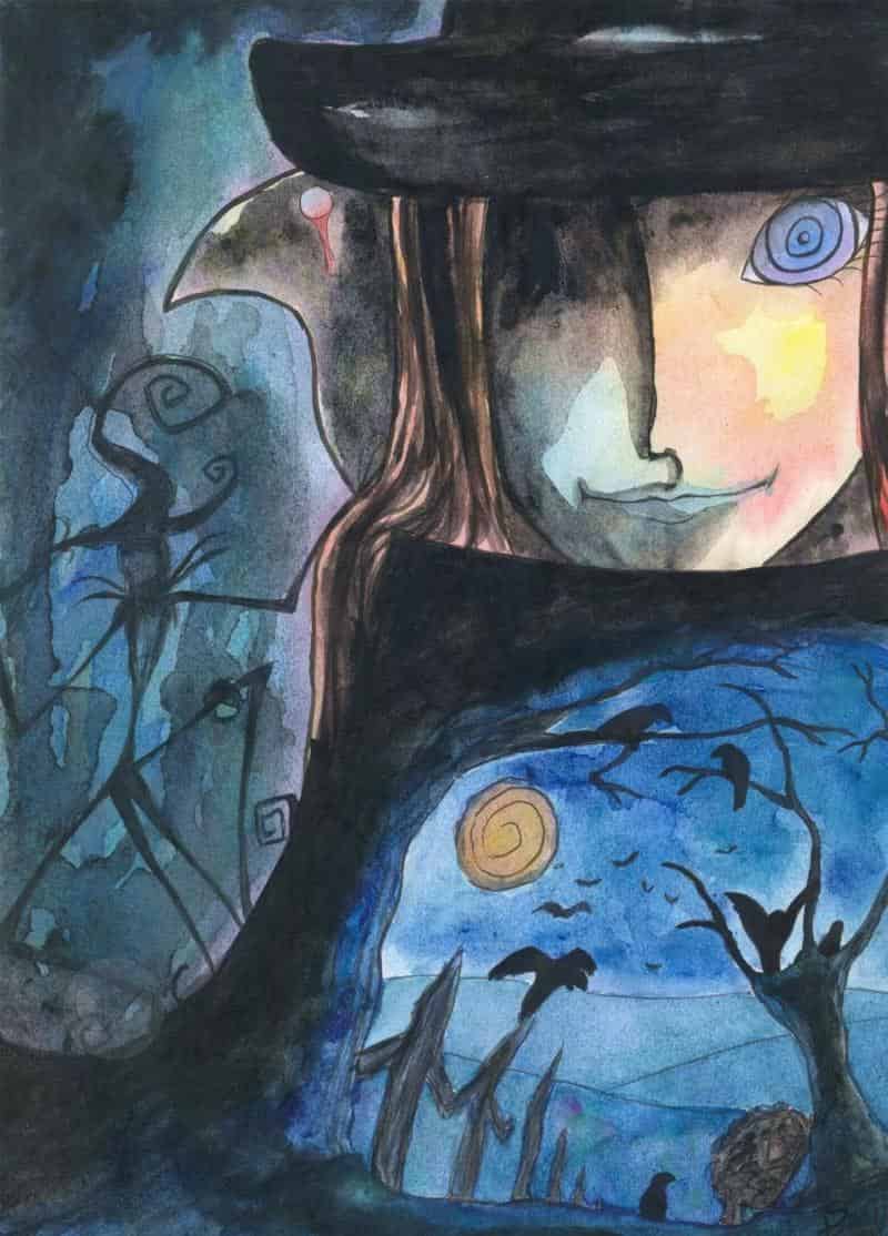 Aber frech wie es nunmal ist, hat mir das Schaf dann dieselbe Aufgabe gestellt, auf die ich hier und jetzt ein Copyright erheben möchte!!! XD Mir fiel wochenlang nichts ein. Bis ich, kurz bevor die zweite Krankheitswelle mich zwei Wochen lang komplett ans Bett fesselte, mit Thommy in Freiburg war und mir aus Spaß an der Freude „Lemony Snickets Rätselhafte Ereignisse“ gekauft habe. Was für ein Film! Und was für ein Soundtrack! Ich habe den Abspann auf Repeat gestellt und dazu ist mir dann obiges Bild eingefallen. Es war eines der furchtbar seltenen Bilder, bei denen man gleich von Anfang an ein gutes Gefühl hat. Die Skizze entstand in einer Viertelstunde und wurde nicht wieder verändert, aber das Colorieren... es hat ganze drei Tage beansprucht, wenn ich mich nicht irre. Dabei habe ich Sheepsz‘ Verschwimmtechnik ausprobiert, die mir bis dahin fast völlig fremd war. Zuerst habe ich großzügig Wasser auf bestimmten Stellen verteilt und bin dann mit verschiedenen Farben in die Vollen gegangen. Nein, HAT das Spaß gemacht! Ich habe mich selten so sehr bei einem Bild austoben können. nur die vielen unerträglich langen, aber leider notwendigen Trockenphasen, haben meine Geduld auf eine harte Probe gestellt. Ich konnte meine Finger kaum stillhalten und habe mich währenddessen halbherzig mit anderen Arbeiten beschäftigt. Ganz zum Schluß kam dann auf erneut angefeuchtetem Papier das Schwarz hinzu, wofür ich aber Tempera und nicht die üblichen Aquarellfarben benutzt habe, weil die Schwarz dort nicht so deckend und intensiv ist, wie bei den dickflüssigen Farben aus der Tube. Und immer lief im Hintergrund der Lemony Snicket Abspann...