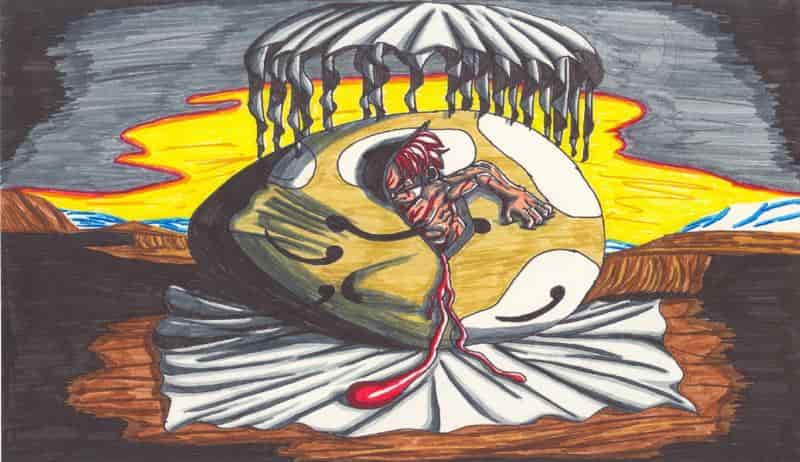 Vorlage hierzu war ein Bild von Salvador Dali, einem Expressionisten der früheren Zeit (kA, welche zeit genau) nya, das bild heißt, glaube ich, geopolitical Child (im Original ist auf der Eierschale der Globus gemalt)