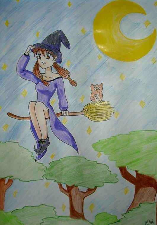 ich mag sie eigentlich... (lila, meine lieblingsfarbe!!) gemalt hab ich sie an verschiedenen orten: 1. bleistift-skizze auf inuyvis geburtstags-party; 2. schwrze umrandung und einen teil der colo in mathe ^^# 3. zu hause dann fertig gecolort. den hintergrund hab ich mal farbig umrandet, weiß nich, gefällt mir einfach---> so sticht die hexe besser raus... *hüstel* bei der farbwahl hat mir mfkgne mit rat und tat zur seite gestanden! (bei der gelegenheit: hallo!!! XD) ich find die kleine eule lustig... ich mag eulen sowieso (können eulen eigentlich auch vogelgrippe kriegen??? ?-? ok, ich und mein schwarzer humor... sorry... v.v ich nehms ja zurück...) tja, schreibt doch einfach iw esie euch gefällt! ich freu mich über kommis!!!