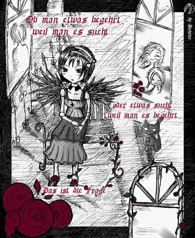 kyuh soll keinen bestimmten Chara aus Rozen Maiden darstellen, ich wollte einfach nur die Atmosphäre, wie sie im N-Feld is , einfangen. der Text is vom Possen-Hasi, glaub ich ^^ Ich liebe diesen Spinner :D . Das war das erste mal,d ass ich nur mit 4 Farben experimentiert hab und die Schattierungen nur von der Rasterung kommt... ^-^