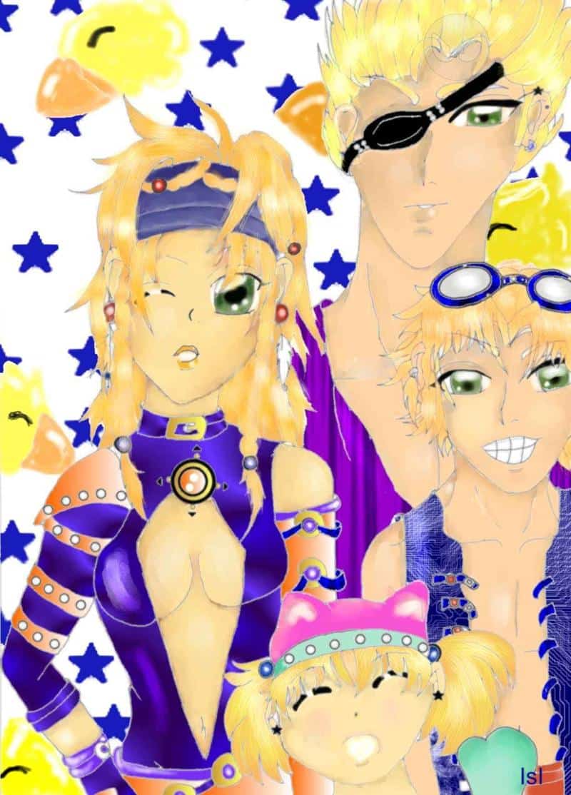 Das is Rikku und Gippel und denen ihrere kleine Family. Das nachziehen der Lienien war zum kotzen. Im Hintergrund sind köpfe von Chokobos ^ ^