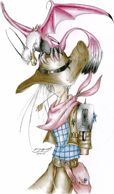 ich weiß noch keinen titel also hab ichs vorübergehend unnamed getauft. das pic soll das cover zu einem meiner dojis sein. darauf sind mein chara neotu und sein gefährte abgebildet, ein adler-drache mischling^^. wundert euch nich das der lauf des revolvers so rechteckich is, der gehört nämlich so ^^'.