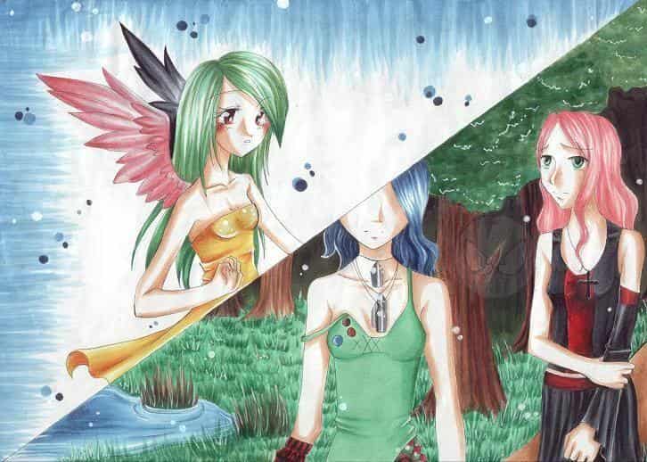 Yo! Hai! =D<br>das ist ein neues collab von mir und Soraya ^^<br><br> Sara hat das engelchen gezeichnet und die haut und das grüne shirt coloriert, der rest der colo und die beiden mädels da unten sind dann auf meinem mist gewachsen <o<<br><br>wir haben mit der colo auf der Leipziger Buchmesse am Samstag angefangen ^_^ und ich durftes dann zu Hause fertig machen (warum eigentlich ICH? Q_Q;;)